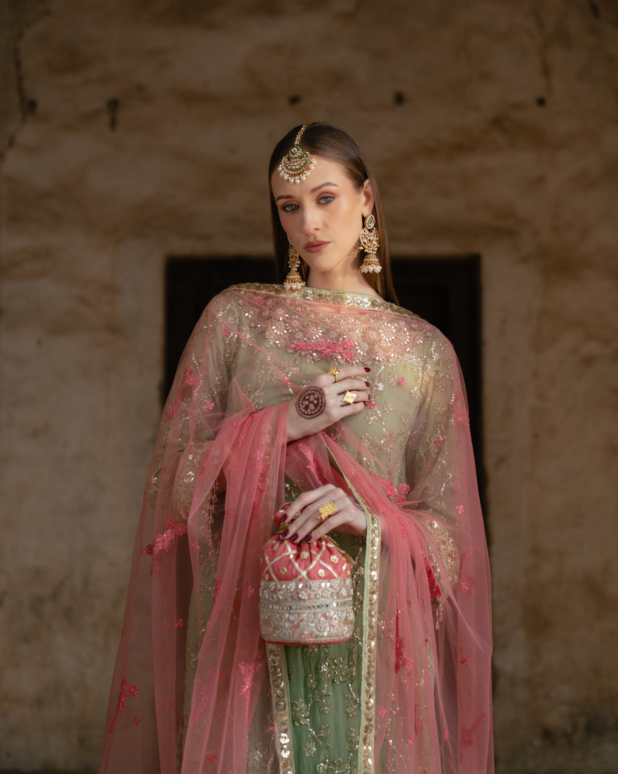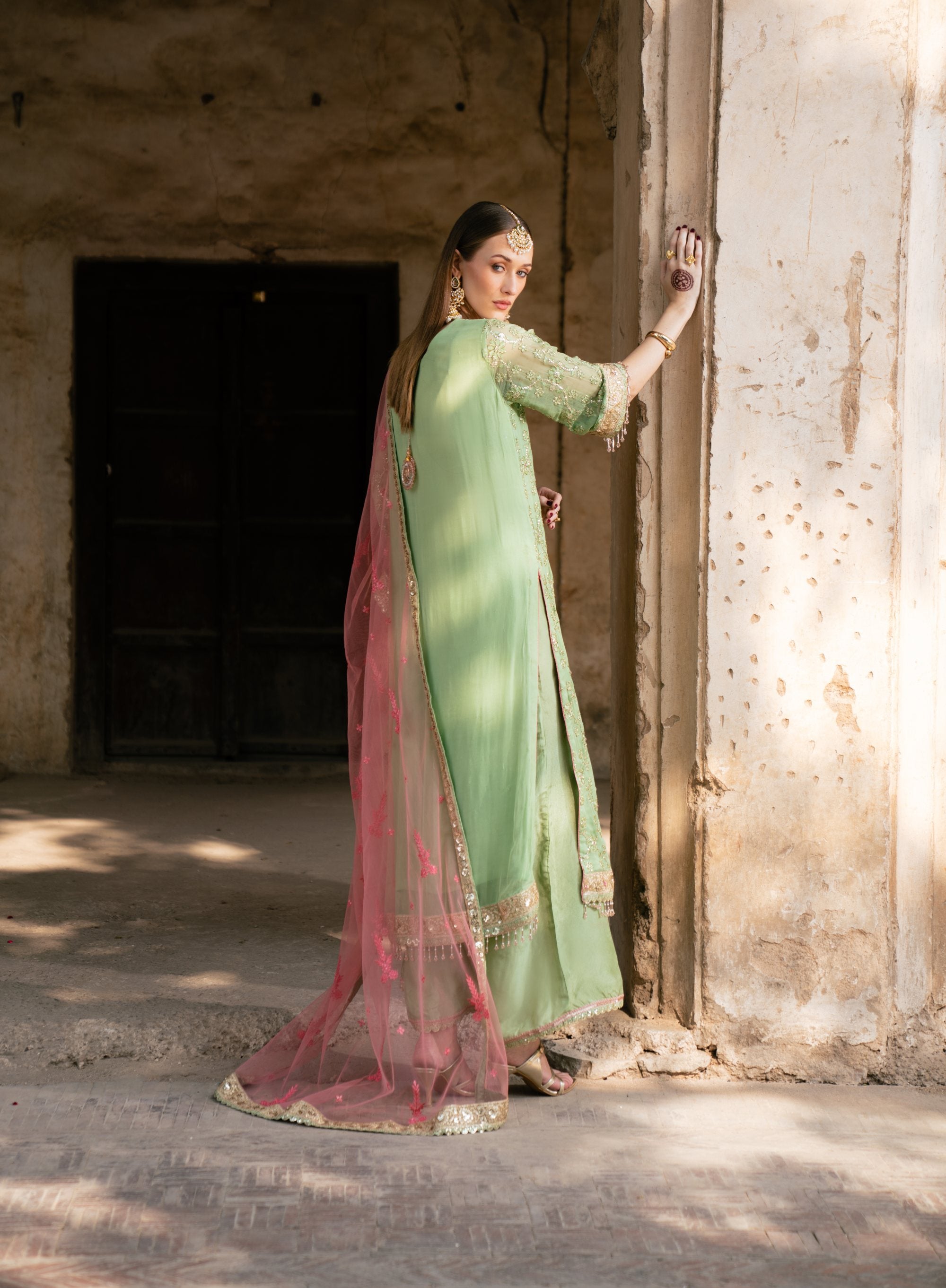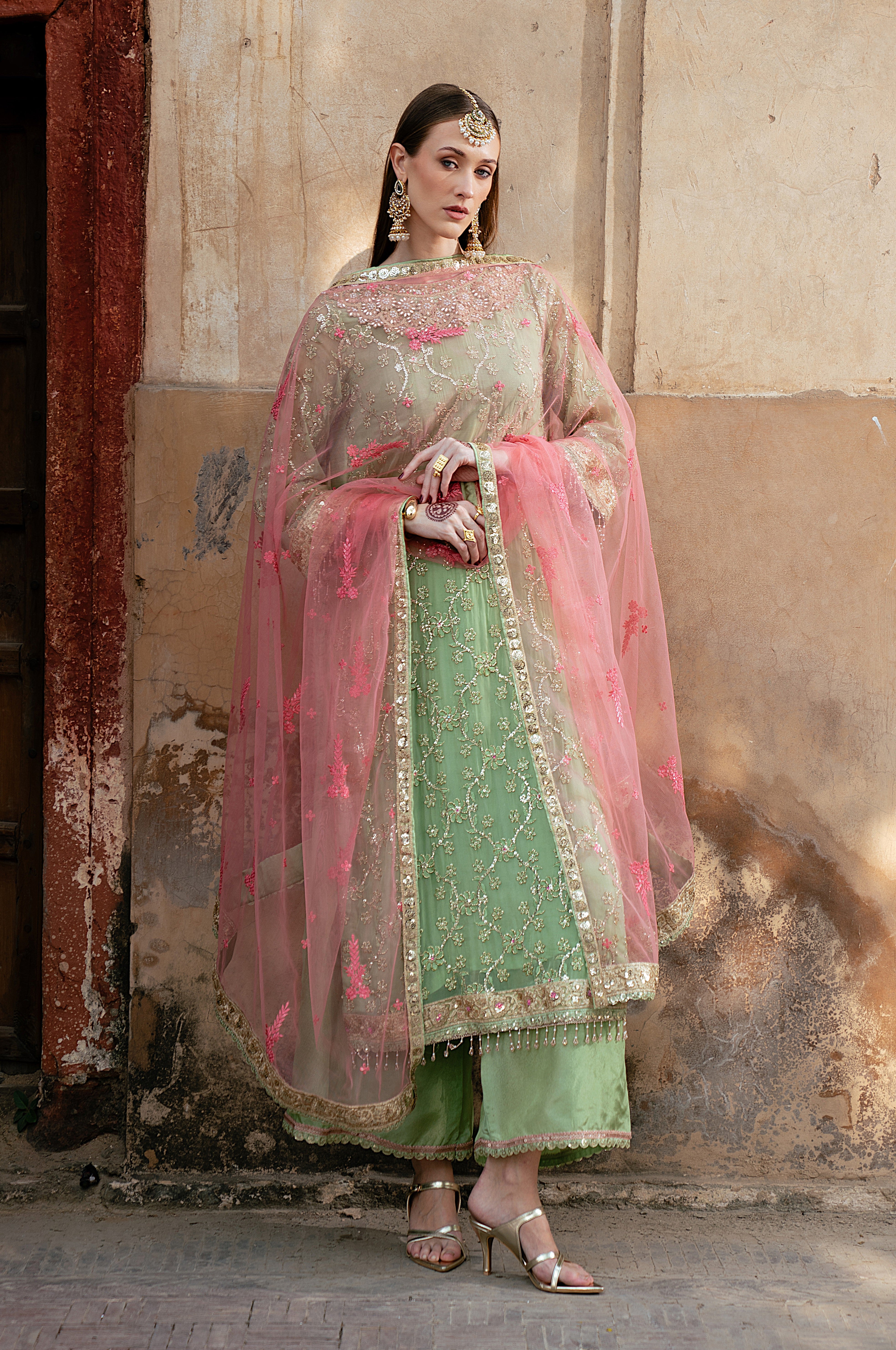 Paired with an embroidered net dupatta, finished with subtle detailing, the ensemble gains movement and charm, while the silk trouser adds a polished, structured balance to the overall look. Soft hues and fine craftsmanship make MAHRAL an ideal choice for weddings, formal gatherings, and celebratory occasions.