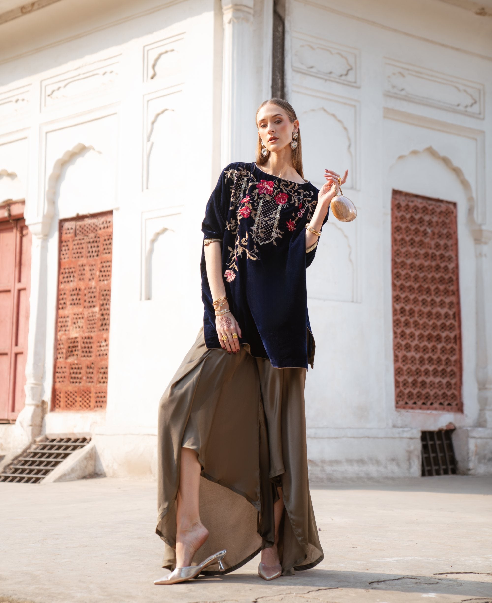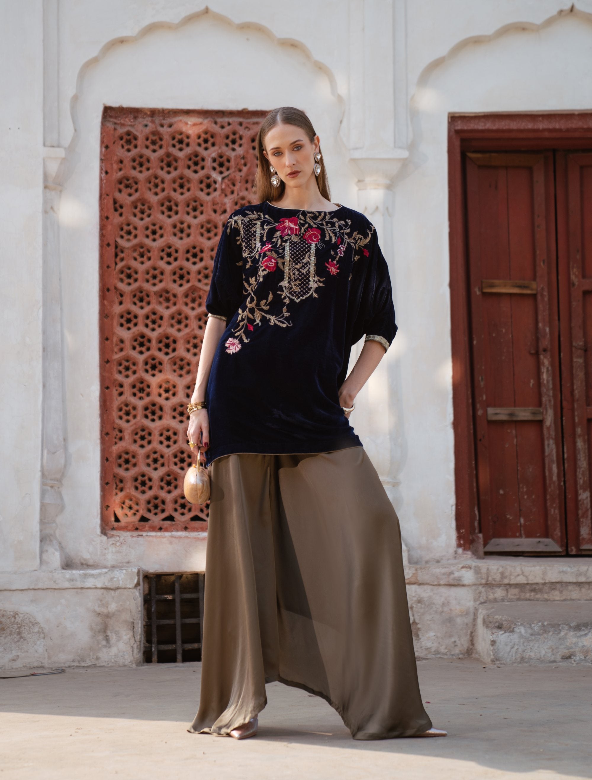 Paired with flowing Shamos silk Flowy Palazzo, tailored in a wide, fluid cut, this outfit balances comfort with sophistication—perfect for evening wear, festive occasions, or statement day looks.
