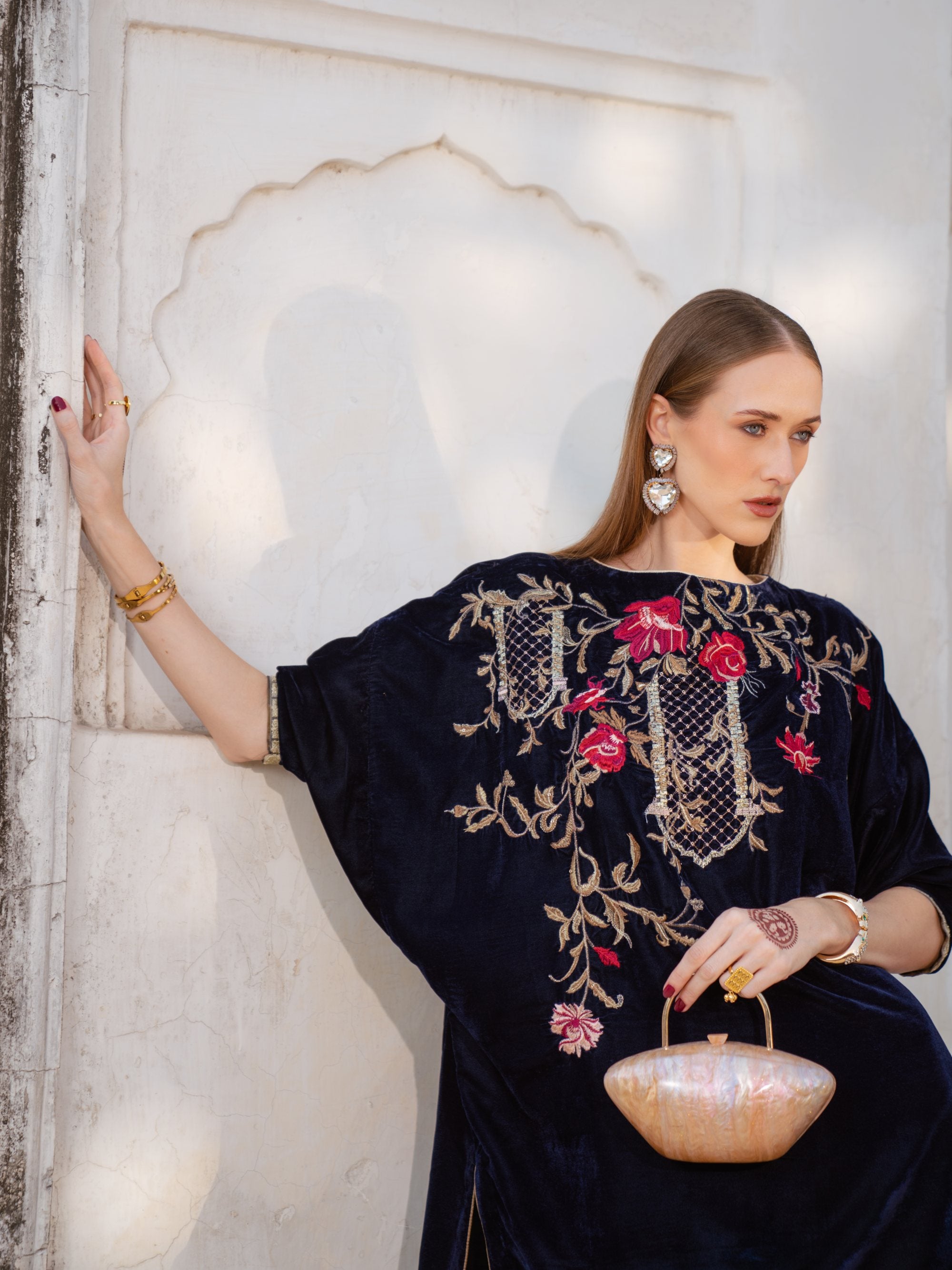 Elevate your wardrobe with this refined two-piece ensemble, designed for understated luxury. The Perimum Micro 9000 velvet top is adorned with delicate floral embroidery, adding texture and elegance to its relaxed silhouette. Rich in tone and soft to the touch, the velvet drapes beautifully for a polished yet effortless look.